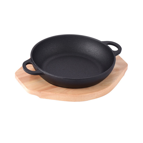 Venta caliente Diseño moderno Sartén de hierro fundido a la parrilla Sartén Forma ovalada Platos chisporroteantes con base de madera